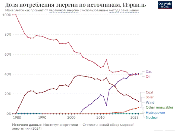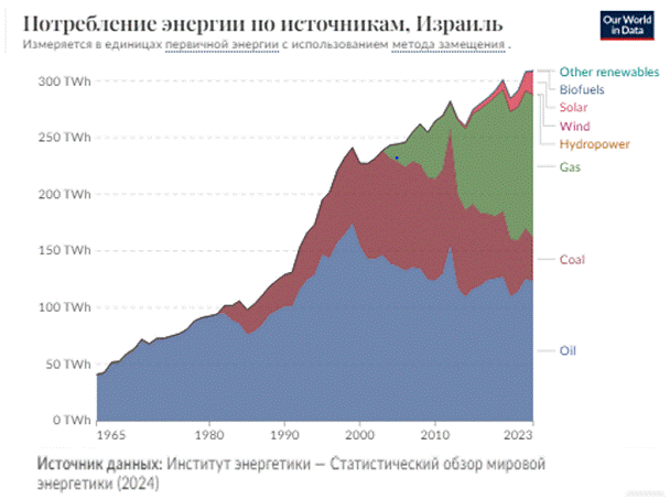 Остановка роста выбросов и даже некоторое снижение связано не с тем, что жидомасоны борются с глобальным потеплением, а с переходом страны с угля на газ после открытия богатых месторождений газа в прибрежных водах. Вот график потребления энергии в Израиле.