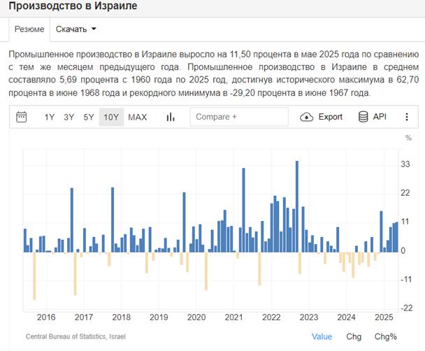 Окислы азота образуются при сжигании газа и другого топлива и вообще при высоких температурах. Канцерогенные вещества – то же следствие промышленных процессов. То есть свою промышленность жидомасоны не гробят, в отличие от их европейских врагов. Ниже графики с сайта https://ru.tradingeconomics.com/. Промышленность Израиля с 1960 года по 2025 год росла со средней скоростью 5,69%, а промышленность Германии с 1979 по 2025 года − на 1,06%.